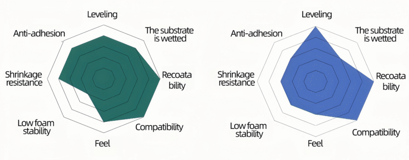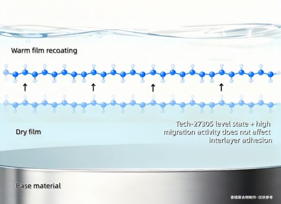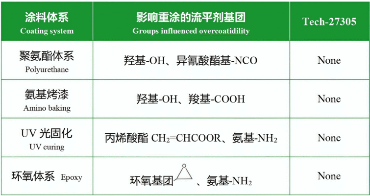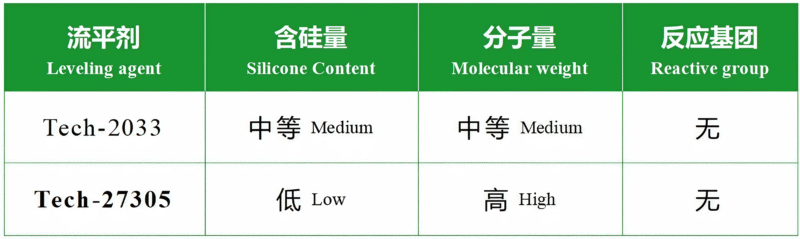 In addition, Tech-27305 leveling agent does not contain functional groups that may affect recoatability, thus avoiding the loss of recoatability of the system due to the participation of end groups in the crosslinking reaction of the resin.