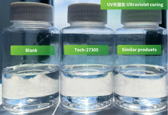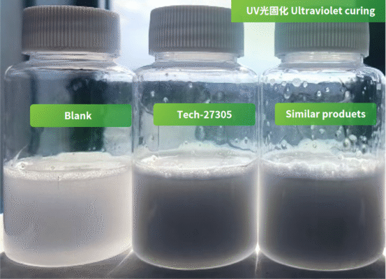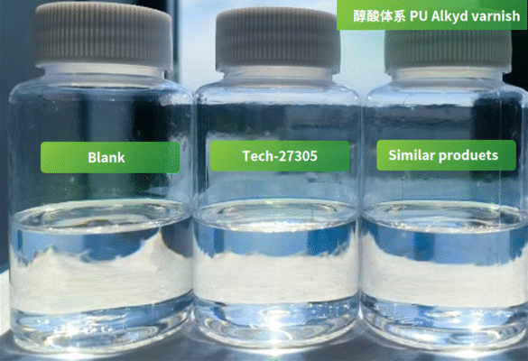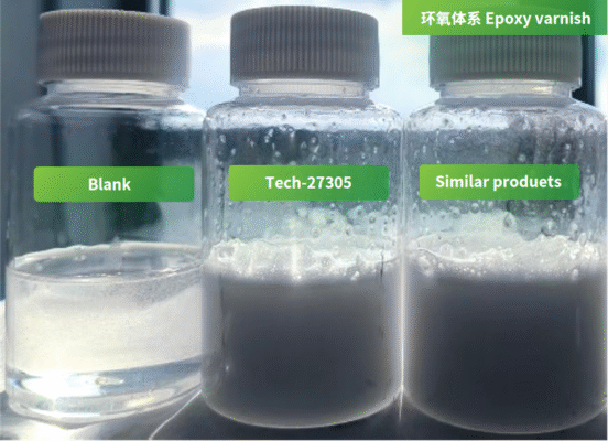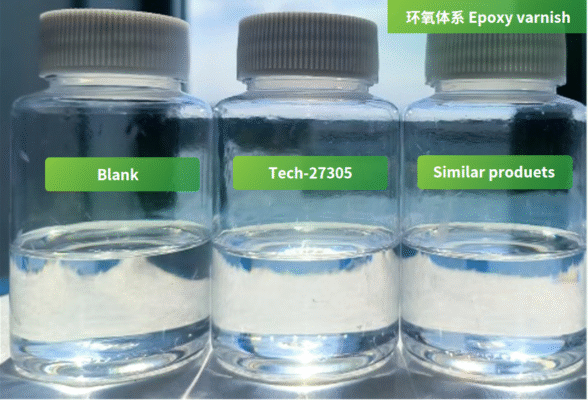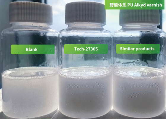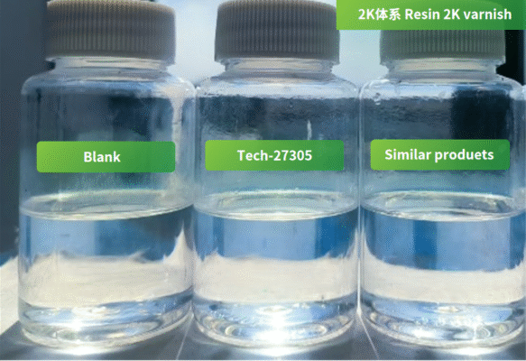Across the four major systems (2KPU, UV, epoxy, alkyd), Tech-27305 leveling agent demonstrates compatibility “indistinguishable from the blank sample,” with no impact on transparency after addition.