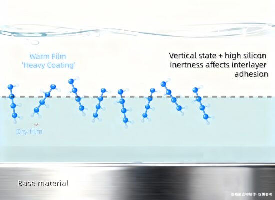 Because that high-silicon polymer has more migration ‘inertia’, a vertical state is easily for on the surface of a paint film when the high-silicon polymer is excessively added, the high-silicon inertia and the vertical state influence the migration of the organic silicon level agent, further influence the interlayer adhesive force, and the organic silicon formed on the surface of the Tech 27305 leveling agent is more ‘sparse’, Its polymer segment structure is more inclined to “lie” on the surface rather than “stand”, which provides a good condition for the rapid migration of silicone to the recoating layer, thus ensuring excellent recoatability.