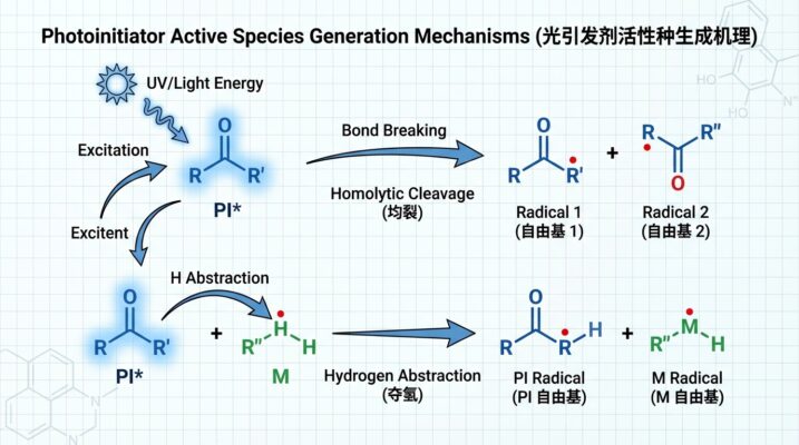 The UV light source emits ultraviolet light within a specific wavelength range. The photoinitiator absorbs UV photons and transitions from the ground state to the excited state. The photoinitiator (PI) generates active species – free radicals. This process can generally be divided into cleavage type (Type I) and hydrogen abstraction type (Type II)