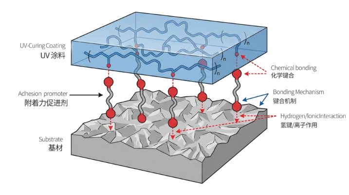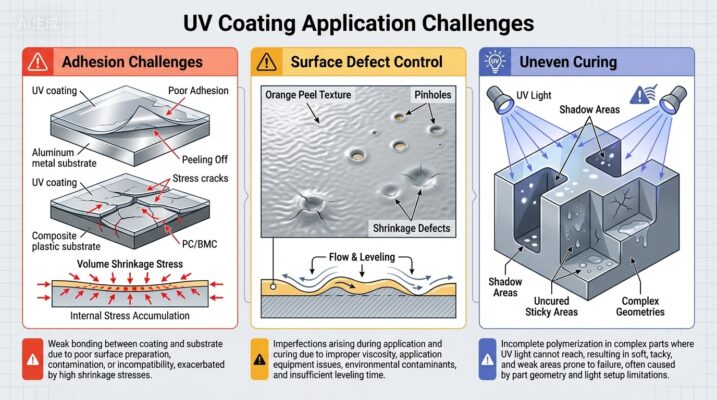 UV coatings are difficult to form effective anchoring on dense substrates such as metals, and the volume shrinkage caused by rapid curing can generate internal stress, leading to a decrease in adhesion. For materials such as glass and PP, adhesion issues are also very tricky.