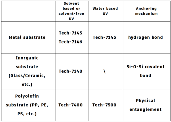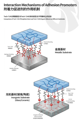Due to its effect on the substrate, the adhesion promoter used varies depending on the surface properties of different substrates. For example, Tech-7145 containing acidic phosphate esters can form hydrogen bonds and anchor with metal substrates; Tech-7140 containing organic silicon can form stable Si-O-Si covalent bonds with inorganic substrates (such as glass and ceramics) and anchor them on the surface of inorganic materials, and is not easily yellowed; For inert substrates that cannot react (such as PP/PE/PS), physical winding is a better