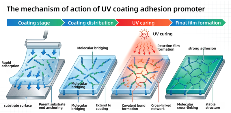 In the above issues, we can solve the problems of adhesion and surface defects by adding suitable adhesion promoters and surface additives. However, before that, we need to understand the reaction mechanism of UV curing and how additives solve pain points from the root? And help you screen suitable products.
