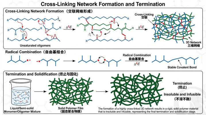 Due to the presence of multiple reactive functional groups in unsaturated oligomers, a triple crosslinked network is formed. When free radicals bind to each other, the active chains are exhausted, and the chain growth reaction is terminated, a strong, insoluble solid polymer film is transformed.