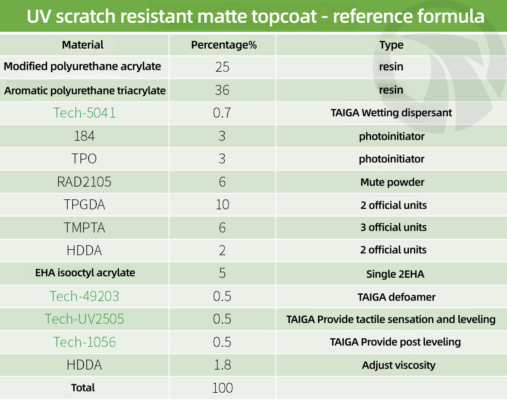 ● UV scratch resistant matte topcoat focuses on high hardness, high toughness, and excellent hand feel, while balancing flexibility and shrinkage, and ensuring deep curing. Multiple surface additives provide hand feel, leveling, and post leveling, ensuring a smooth and even matte surface and comfortable hand feel.