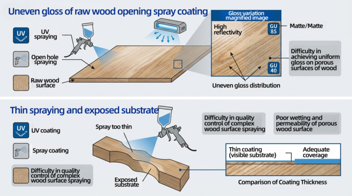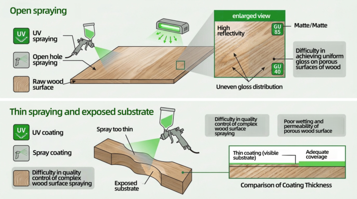 ① Uneven film thickness and poor fullness: In open spraying, the surface of wood is loose and porous, with uneven texture, which may cause selective absorption of paint (more paint absorption in porous areas and less paint absorption in dense areas), affecting the uniformity of high gloss.