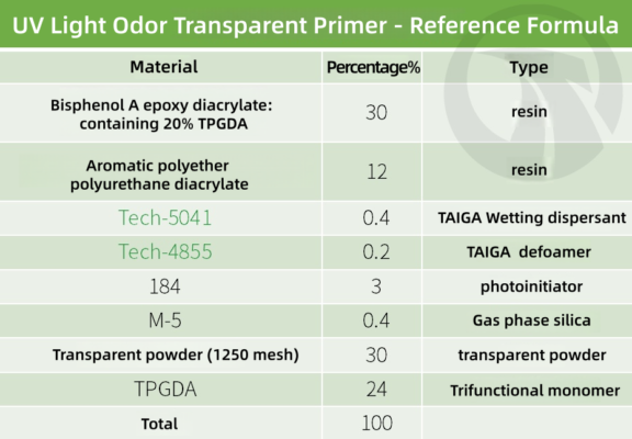 ● UV lightweight transparent primer focuses on efficient filling, strong adhesion, easy polishing, and construction stability. Wetting dispersant is used to wet and disperse 30% of transparent powder, preventing it from settling and clumping during storage and construction, ensuring uniform paint film and consistent polishing performance.