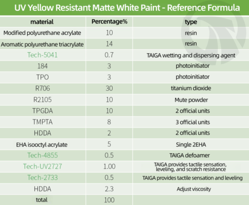 ● UV anti yellowing matte white surface paint focuses on high coverage, matte finish, and long-lasting resistance to yellowing, while also balancing hand feel and scratch resistance. At high powder content (titanium dioxide+matte powder), wetting and dispersing agents are used to ensure stable pigment dispersion, prevent sedimentation and coarsening.
